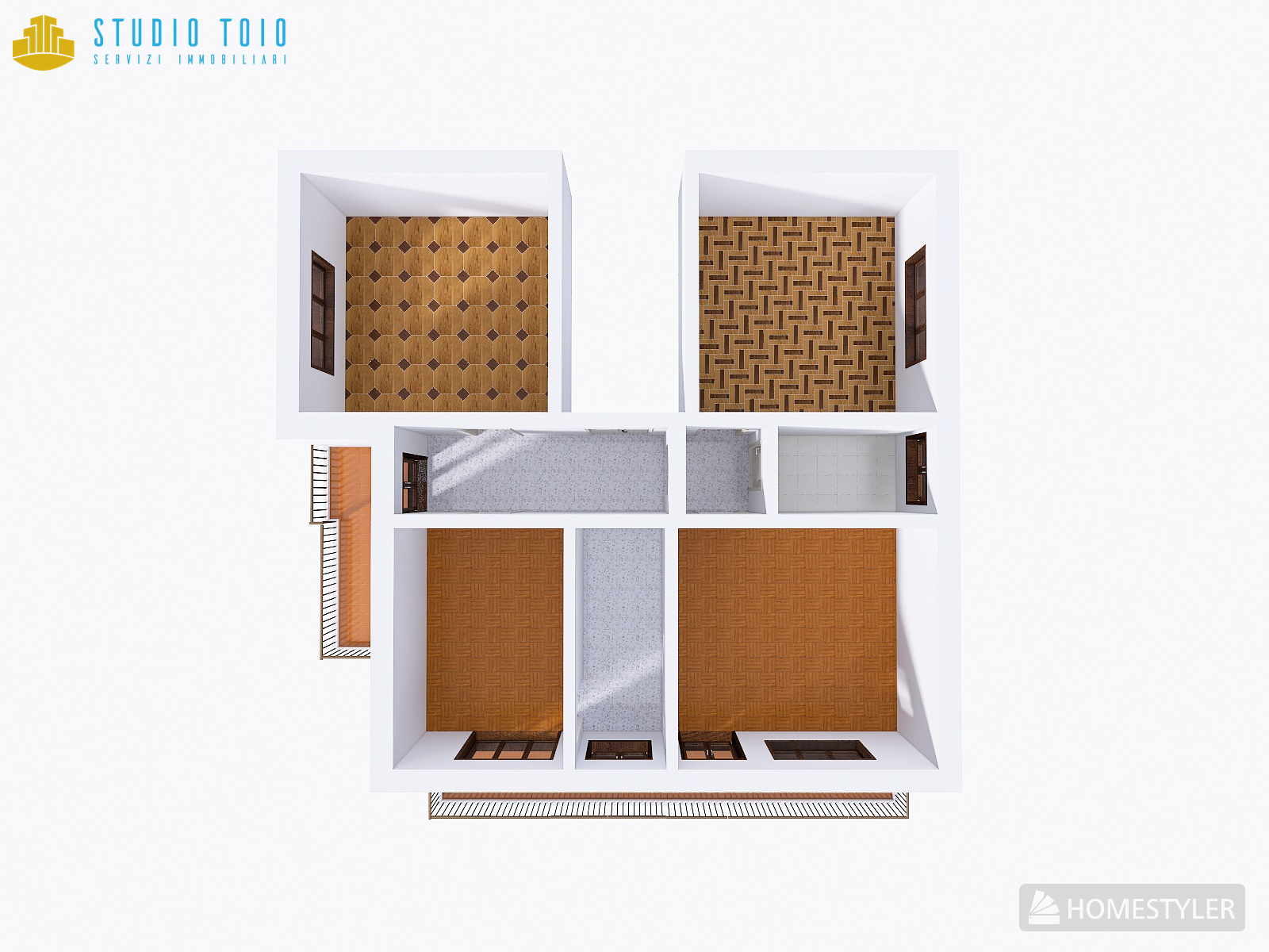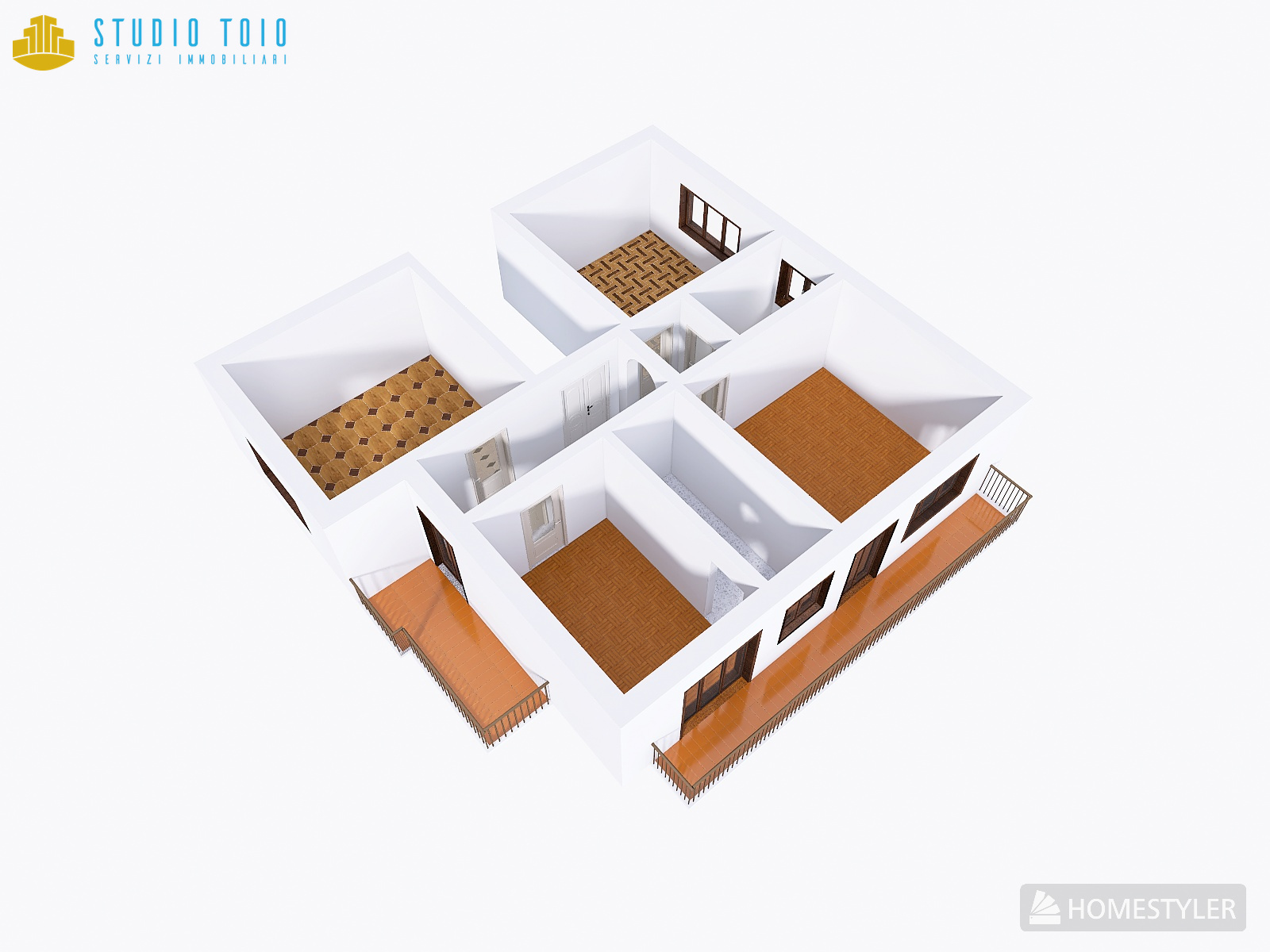 L’ingresso, condiviso con una sola altra unità, conduce all’appartamento disposto interamente su un unico livello e composto da ingresso, tinello con sala da pranzo, soggiorno, due camere da letto matrimoniali e bagno con vasca.